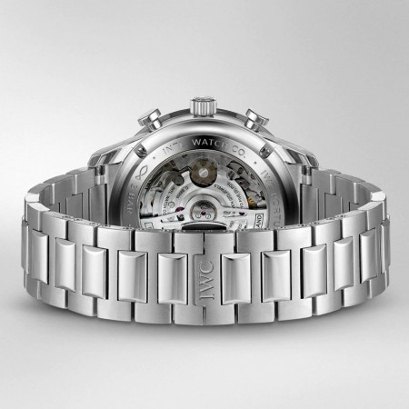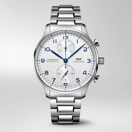 Un cadran ouvert et épuré équipé de totaliseurs en retrait et d’un réhaut interne avec un champ gradué en quart de secondes; la formule gagnante de la Portugieser Chronographe. Avec ce modèle, IWC conférait il y a plus de 20 ans un design plus sportif à la famille Portugieser. Aujourd’hui, ce chronographe à la modernité intemporelle est disponible pour la première fois avec un bracelet en acier fin. Il est magnifiquement détaillé et minutieusement parachevé par des surfaces polies et satinées. Grâce à la boucle papillon, il s'adapte de manière ergonomique au poignet pour un confort optimal. Avec ce bracelet robuste et résistant à la corrosion, la Portugieser Chronographe devient un accessoire encore plus polyvalent. Ce modèle possède un boîtier en acier fin, avec un cadran argenté parcouru d'aiguilles et appliques de couleur bleue. Il est entraîné par le calibre de manufacture IWC 69355. Le mouvement robuste et précis de ce chronographe doté d’une structure à roue classique est visible à travers un fond en verre saphir et présente un système de remontage à cliquet automatique.